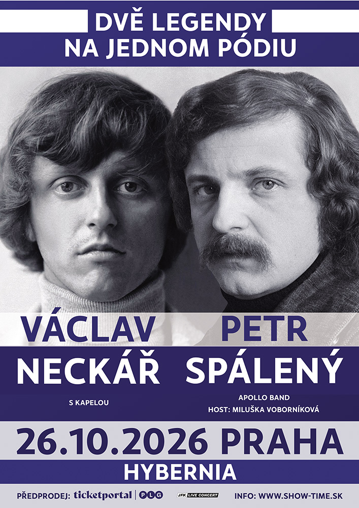 Divadlo Hybernia bude 26. 10. 2026 v 18.30 hodin svědkem společného koncertu legend Václava Neckáře a Petra Spáleného, kteří se poprvé setkají na jednom dvouhodinovém koncertě. Těšit se můžete také na hosta – neodmyslitelnou součástí koncertů Petra Spáleného je jeho manželka Miluška Voborníková.